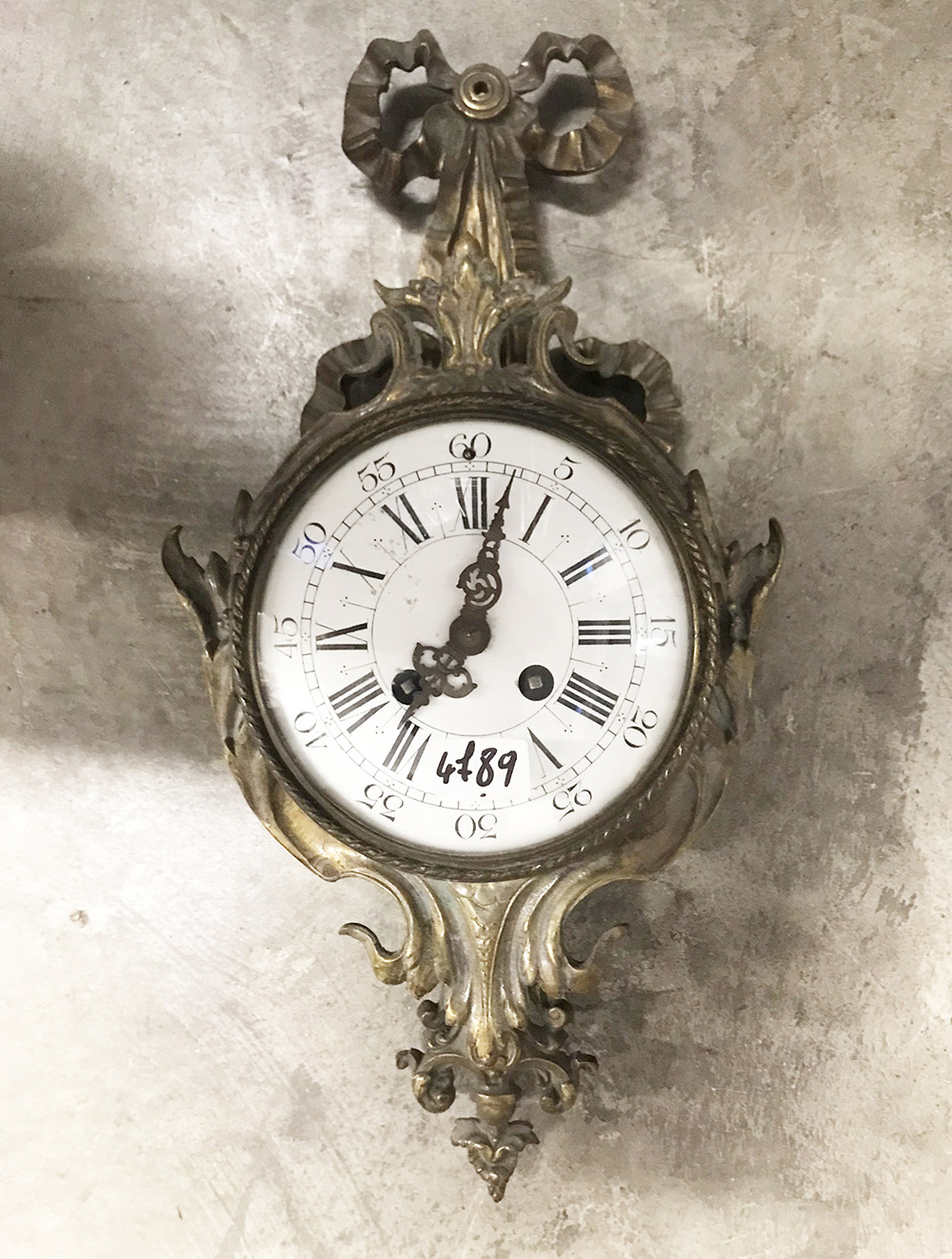 Orologio a pendolo da parete con cassa in bronzo dorato e cesellato a motivi vegetali e nastro, quadrante smaltato a numeri arabi e romani, movimento con carica settimanale, suoneria delle ore e delle mezze su campanello, fine del secolo XIX (H cm 41)(difetti)