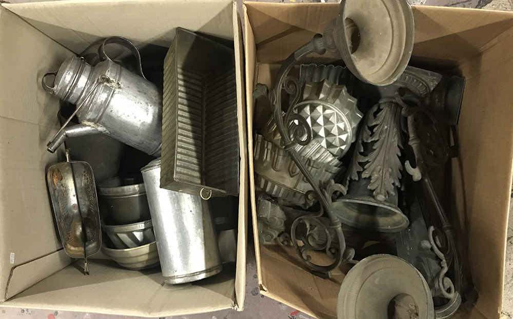 Due cartoni contenenti numerosi oggetti diversi in metallo e bronzo