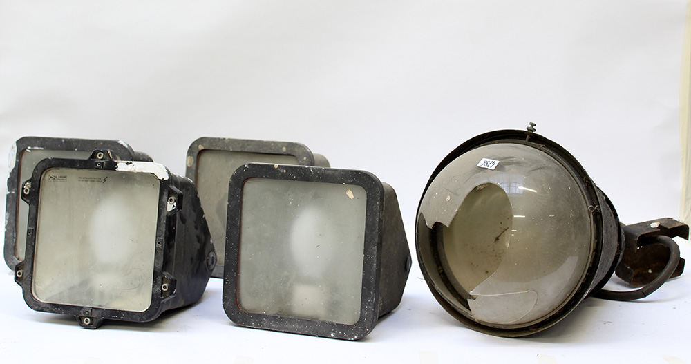Lotto composto da quattro lampade da esterni Ingegnere Castaldi Illuminazione Modello Egeo unite a una lampada a sospensione di Achille e Piergiacomo Castiglioni proveneniete dalla birreria Splugen-Brau di Milano. (gravi difetti e rotture)