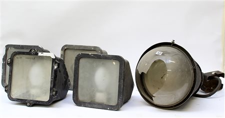 Lotto composto da quattro lampade da esterni Ingegnere Castaldi Illuminazione Modello Egeo unite a una lampada a sospensione di Achille e Piergiacomo Castiglioni proveneniete dalla birreria Splugen-Brau di Milano. (gravi difetti)
