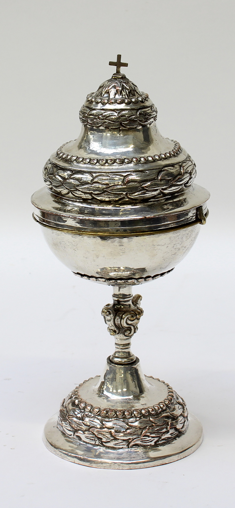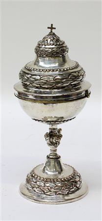 Pisside in metallo argentato decorata a foglie concatenate (h cm 31)