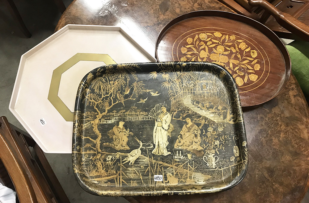 Lotto composto da un vassoio ovale in legno intarsiato a fiori, uno ottagonale in plastica bianca ed uno in metallo decorato a cineserie (difetti)