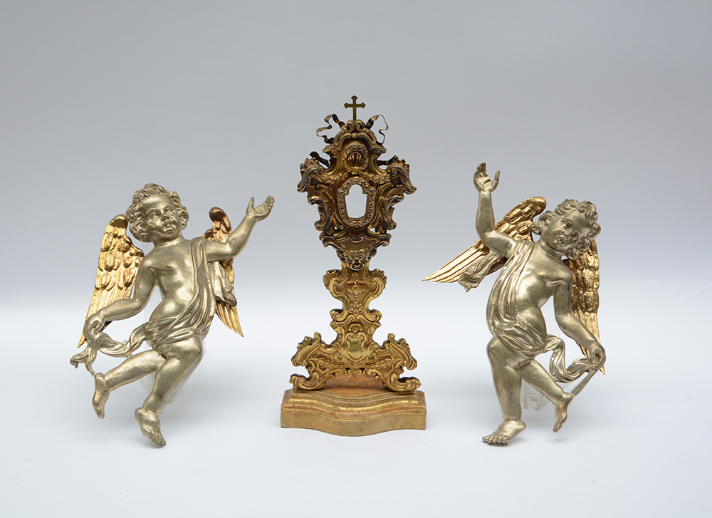 Lotto composto da una coppia di angeli alati in metallo ed un antico portareliquie (difetti)
