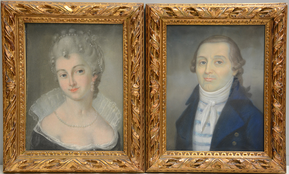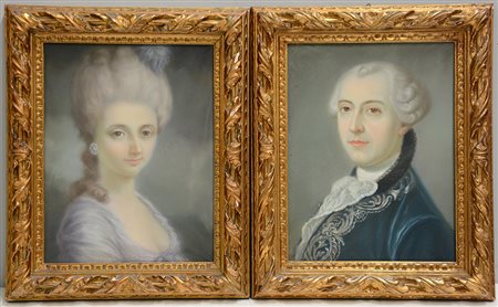 Ignoto, "Gentildonne e gentiluomini" gruppo di quattro pastelli (cm 41x31,5) in cornici intagliate e dorate (difetti)