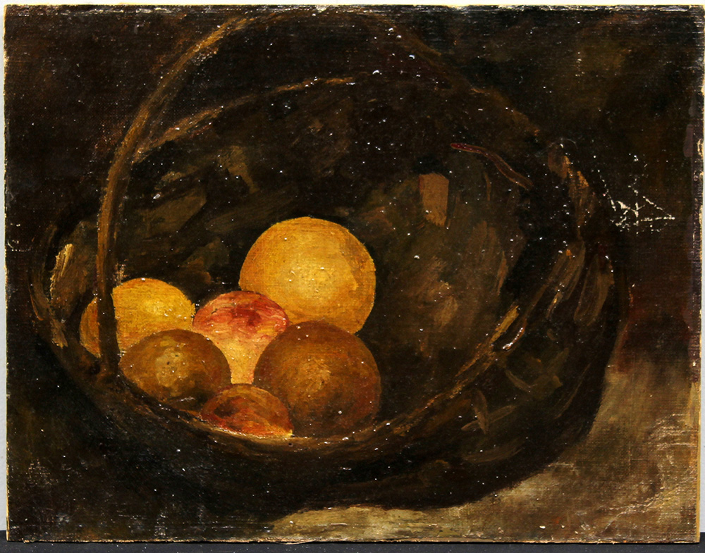 Ignoto "Cesto con frutta" antico frammento ad olio su tela apllicata su panforte (cm 30x39) (difetti)