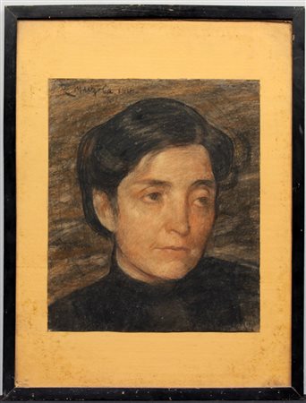 (Attivo nella prima metà del XX secolo) "Pensiero..." 1914 disegno a matita e carboncino (cm 37x31) firmato e datato in alto a sinistra. Al retro: etichetta e tibro della società per le belle arti esposizione permanente Milano 1920, in cornice (difetti)