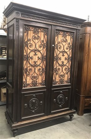 Armadio a due ante decorate in ferro battuto nella parte superiore e a rosoni intagliati nella parte inferiore (cm 150x210x60) (difetti)