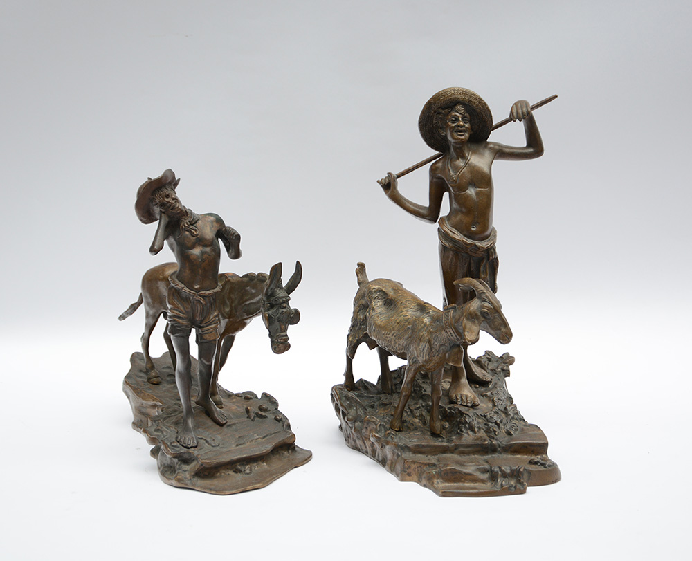 Scultore napoletano, secolo XX "Pastorelli con asino e capra" due gruppi in bronzo (h max cm 35)
