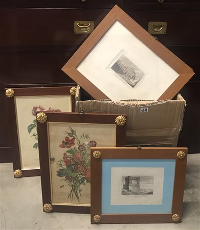 Lotto composto da undici stampe raffiguranti fiori e paesaggi, misure diverse. In cornici (difetti)