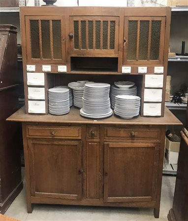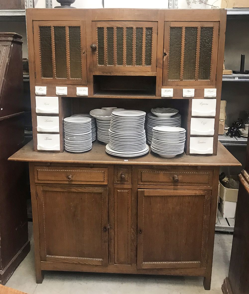 Mobile a due corpi, parte superiore a tre ante a vetri e cassettini in ceramica bianca. Parte inferiore a due tiretti, due cassetti e due sportelli, inizio secolo XX (cm 150x192x54) (difetti e mancanze)
