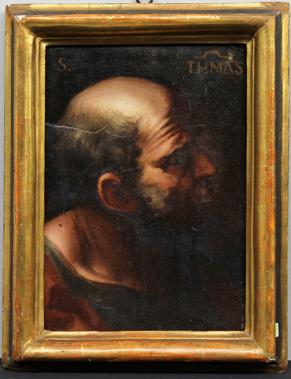 Scuola del secolo XVII, "San Tommaso" olio su tavola (cm 36x25) in cornice antica (difetti e restauri)
