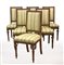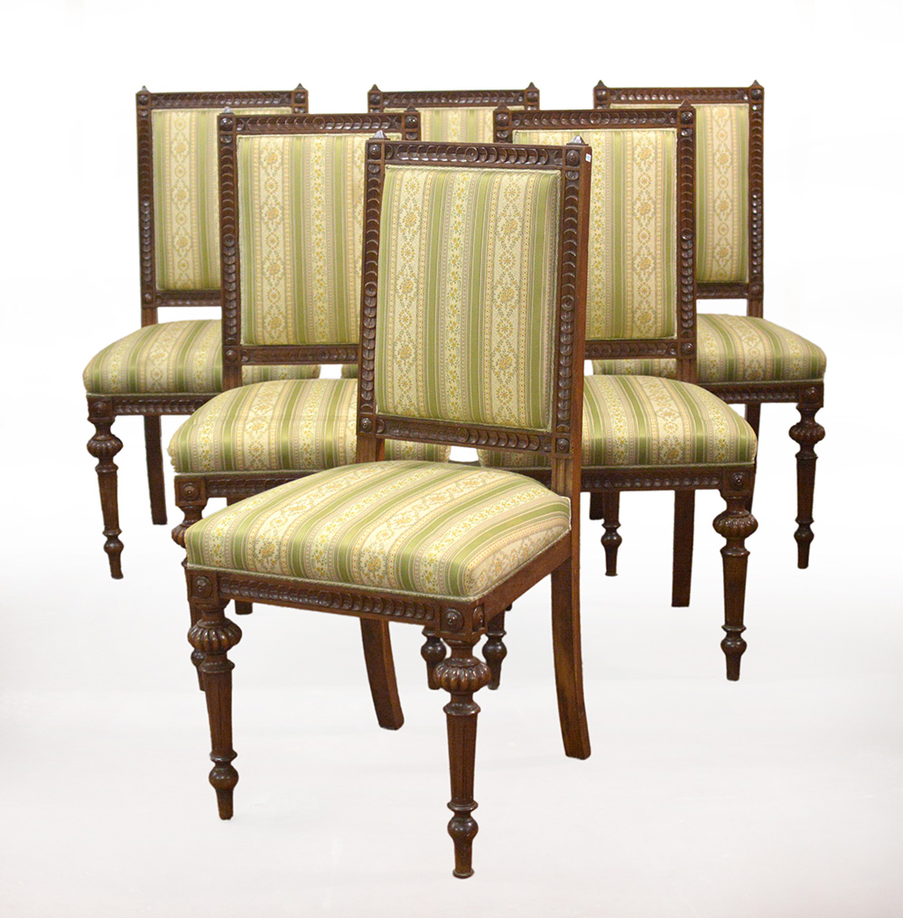 Gruppo di sei sedie in noce con schienale decorato ad unghiature, gambe anteriori tornite intagliate all'attacco, rivestite in tessuto a righe