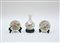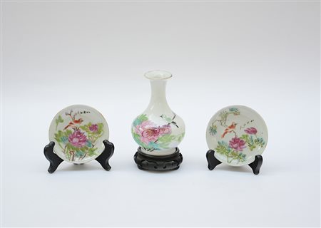 Lotto composto da un vasetto con base in legno e due piattini decorati in policromia a motivi vegetali e uccelli, Cina secolo XX (difetti)