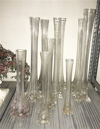 Gruppo di dieci portafiori in vetro a collo stretto (difetti)