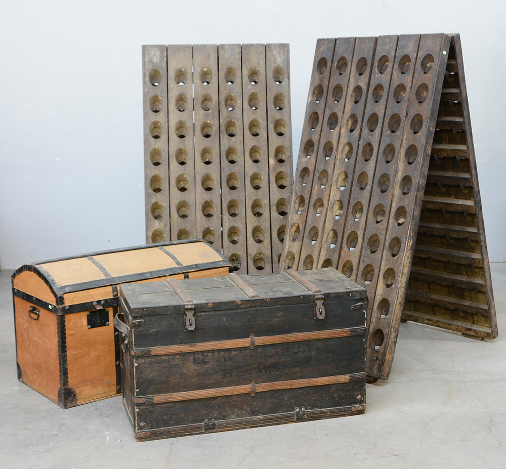 Lotto composto da due bottigliere e due vecchi bauli in legno e metallo (difetti)
