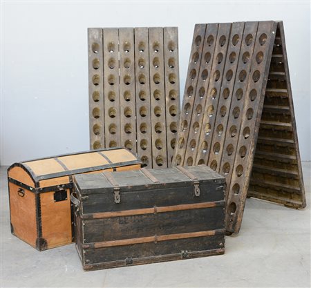 Lotto composto da due bottigliere e due vecchi bauli in legno e metallo...