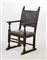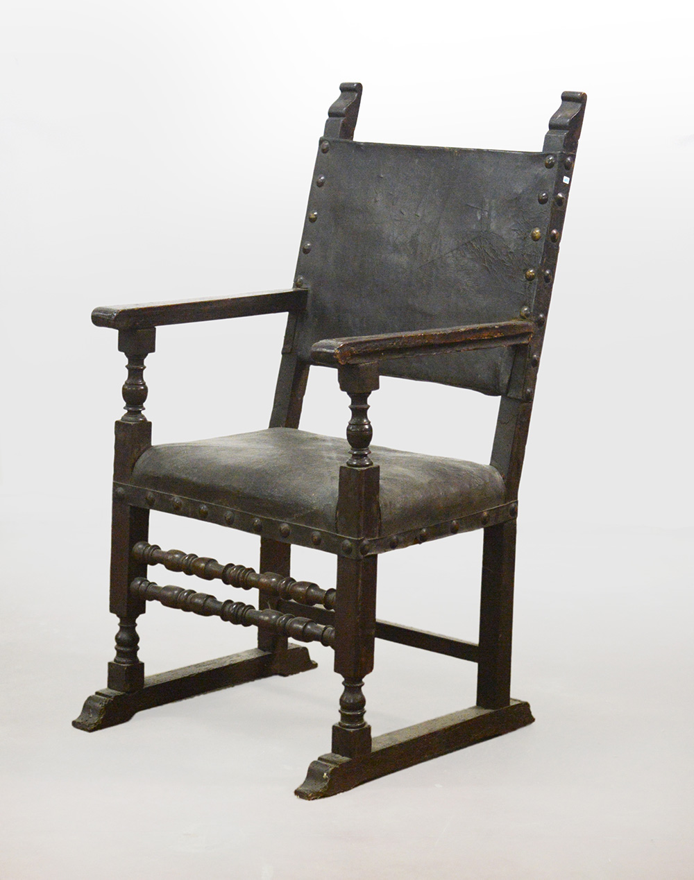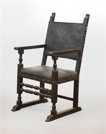 Poltrona in noce con braccioli dritti, traverse tornite, piedi a ciabatta, puntali sagomati. Schienale e seduta in pelle, secolo XVII (difetti)