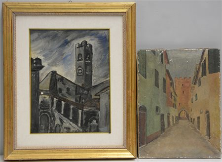 Lotto composto da due dipinti ad olio raffiguarnti scorci con case, autori e...
