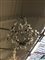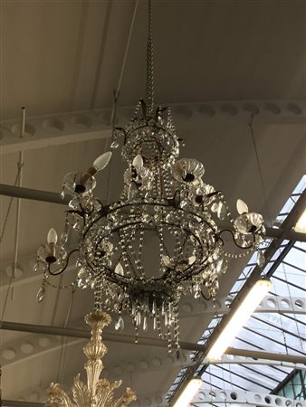 Lampadarietto a cesto a docici fiamme disposte su due file, struttura in metallo, gocce e perlinature in vetro (h cm 100)(difetti e mancanze)