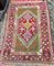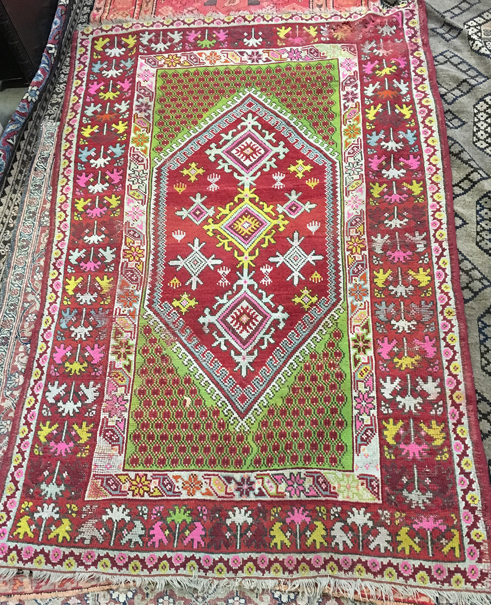 Decoro con tre piccoli medaglioni romboidali su fondo rosso. Angolari a fondo verde prato con piccoli motivi geometrici in rosso (cm 210x124)(difetti)