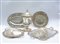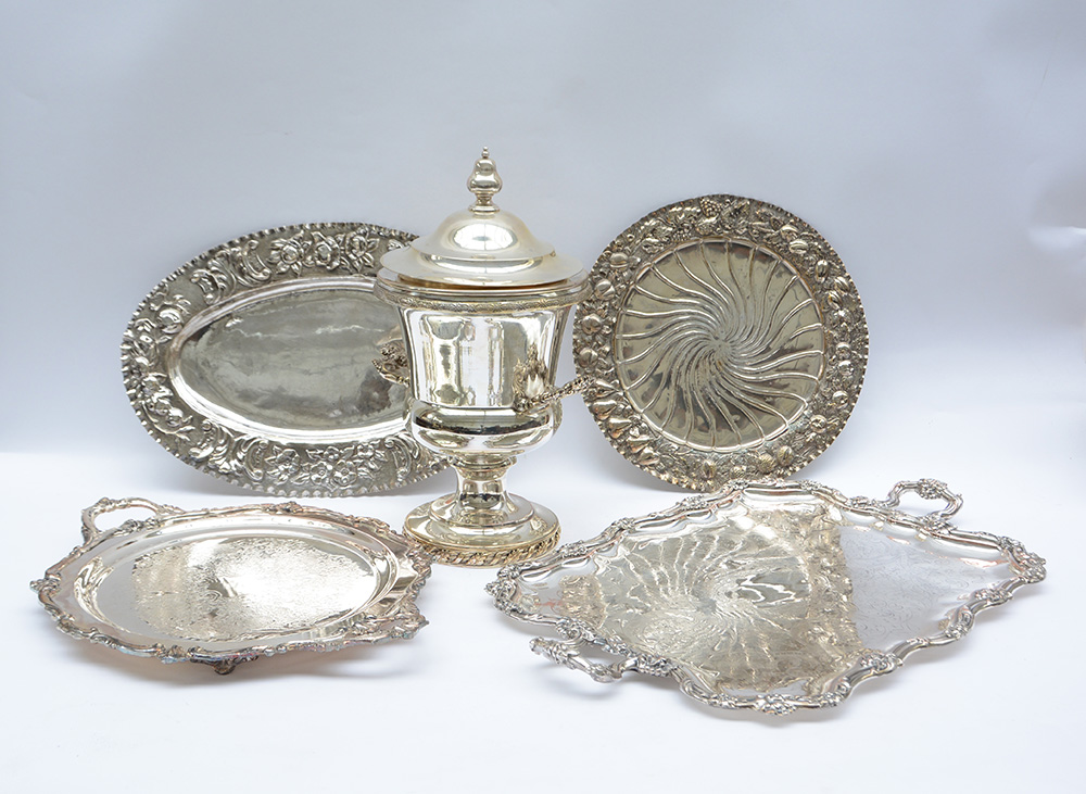 Cartone contenente un vassoio biansato, un portaghiaccio e tre oggetti diversi in metallo argentato (difetti)