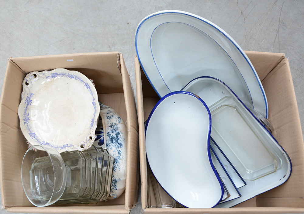 Due cartoni contenenti numerosi oggeti in metallo smaltato, vetro e ceramica (difetti)