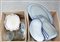 Due cartoni contenenti numerosi oggeti in metallo smaltato, vetro e ceramica...