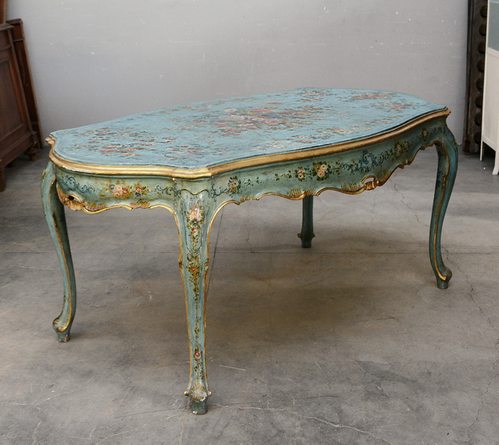 Tavolo in stile settecentesco veneziano in legno laccato azzurro ed in policromia a mazzi di fiori sparsi, farfalle e dorature, fascia e gambe sagomate (cm 184x80x100)(difetti)