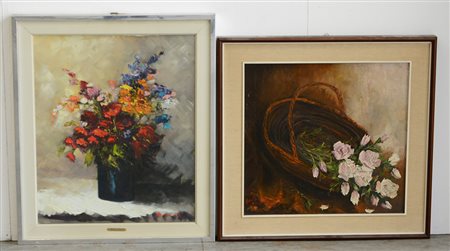 Lotto composto da due dipinti ad olio raffiguranti vasi con fiori di autori e...