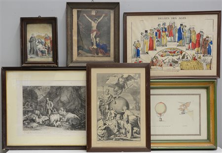 Lotto composto da sei stampe di epoche, soggetti e misure diverse, in cornici...