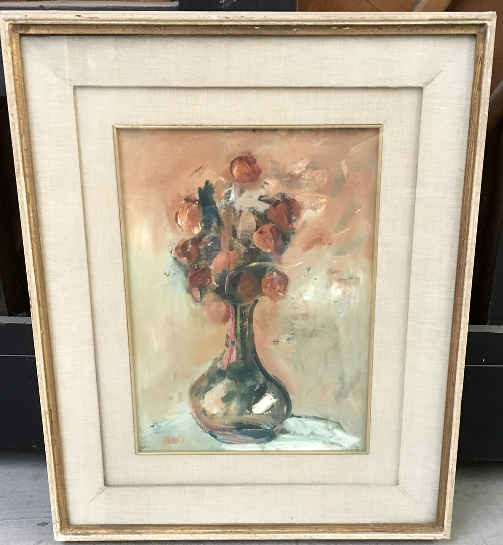 "Vaso con fiori secchi" 1966, olio su cartone telato. Inscritto al retro (cm 35x30) In cornice