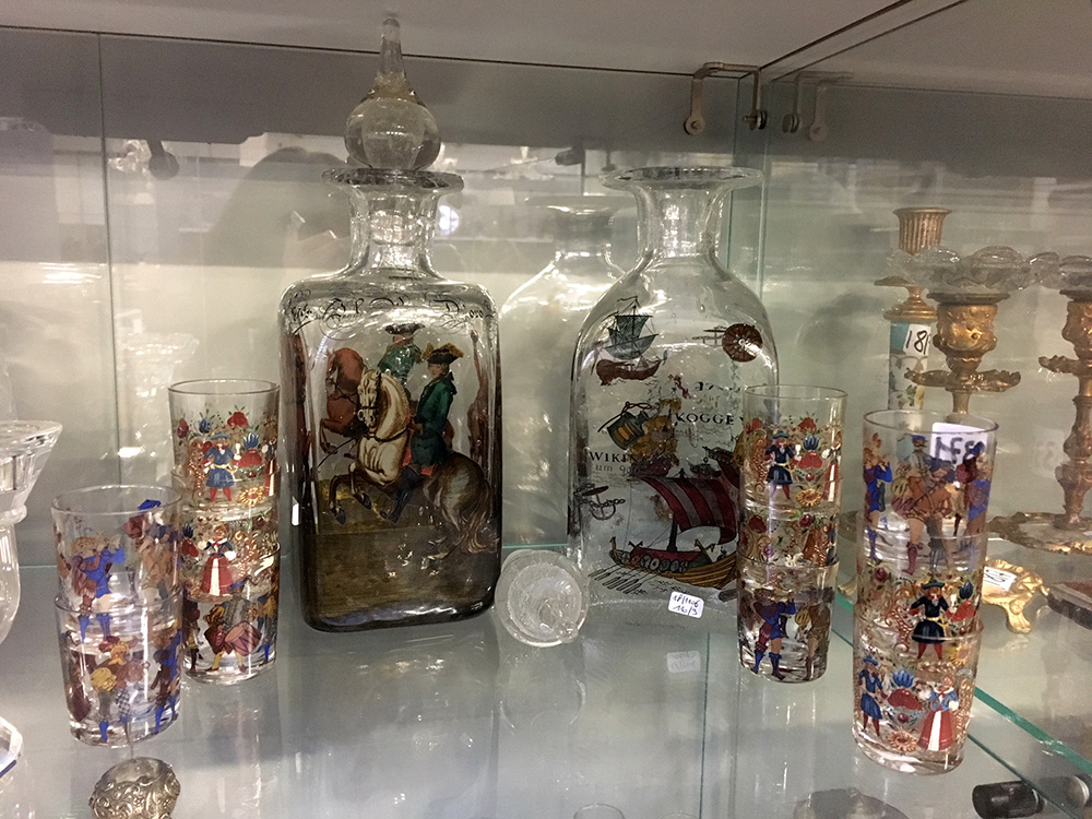 Manifattura del sec. XIX. Lotto composto da due bottiglie con tappi e undici bicchieri in vetro dipinti con cavalieri, navi e figure (difetti)