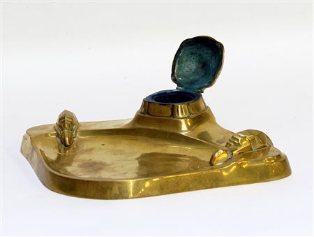 Calamaio liberty in ottone decorato con animali stilizzati, iscritto sotto la...