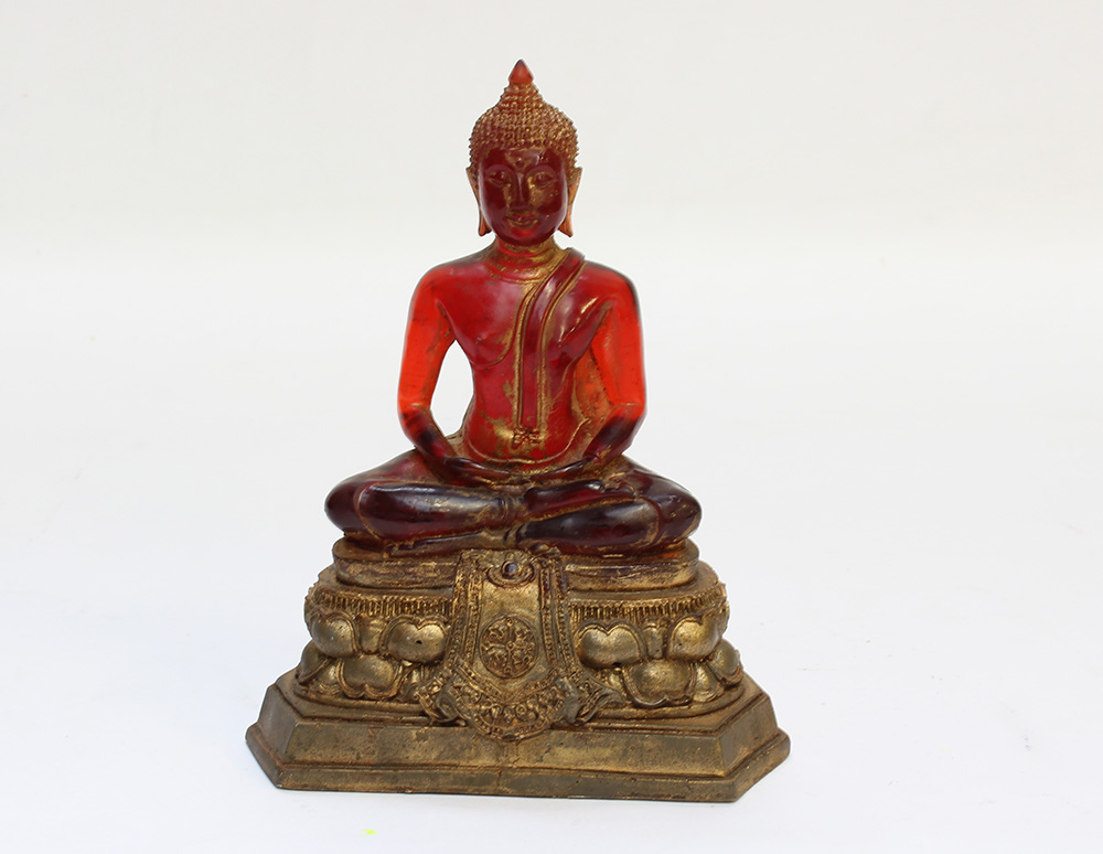Buddha in resina seduto su base in metallo dorato (difetti)