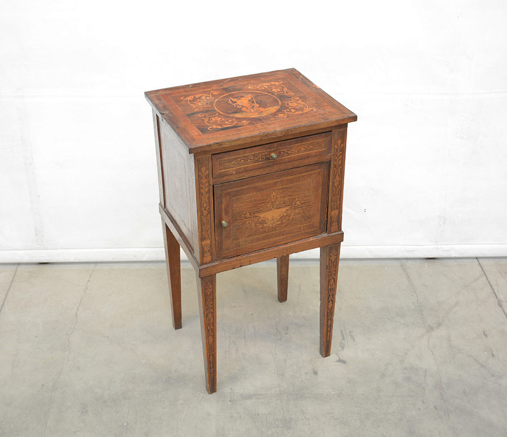 Comodino ad un'anta e un cassetto intarsiato a volute fogliate e a putto...