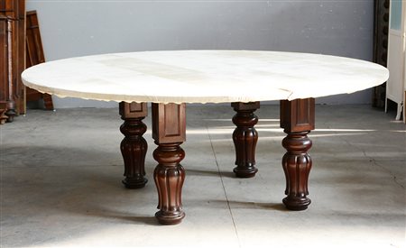 Tavolo a quattro gambe a colonna squadrata e tornita, fine del secolo XIX, piano tondo in compensato di epoca posteriore (d cm 212 x h cm 79)(difetti)