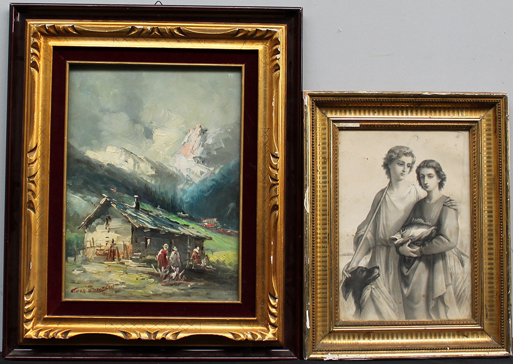 Lotto composto da un'antica incisione raffigurante giovinetti con cane e un dipinto ad olio su tela raffigurante scorcio montano, autori e misure diverse, in cornici