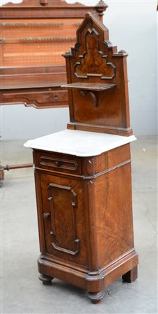 Comodino con alzata in noce e radica di noce ad un anta ed un cassetto, piano in marmo, Lombardia secolo XIX (difetti)