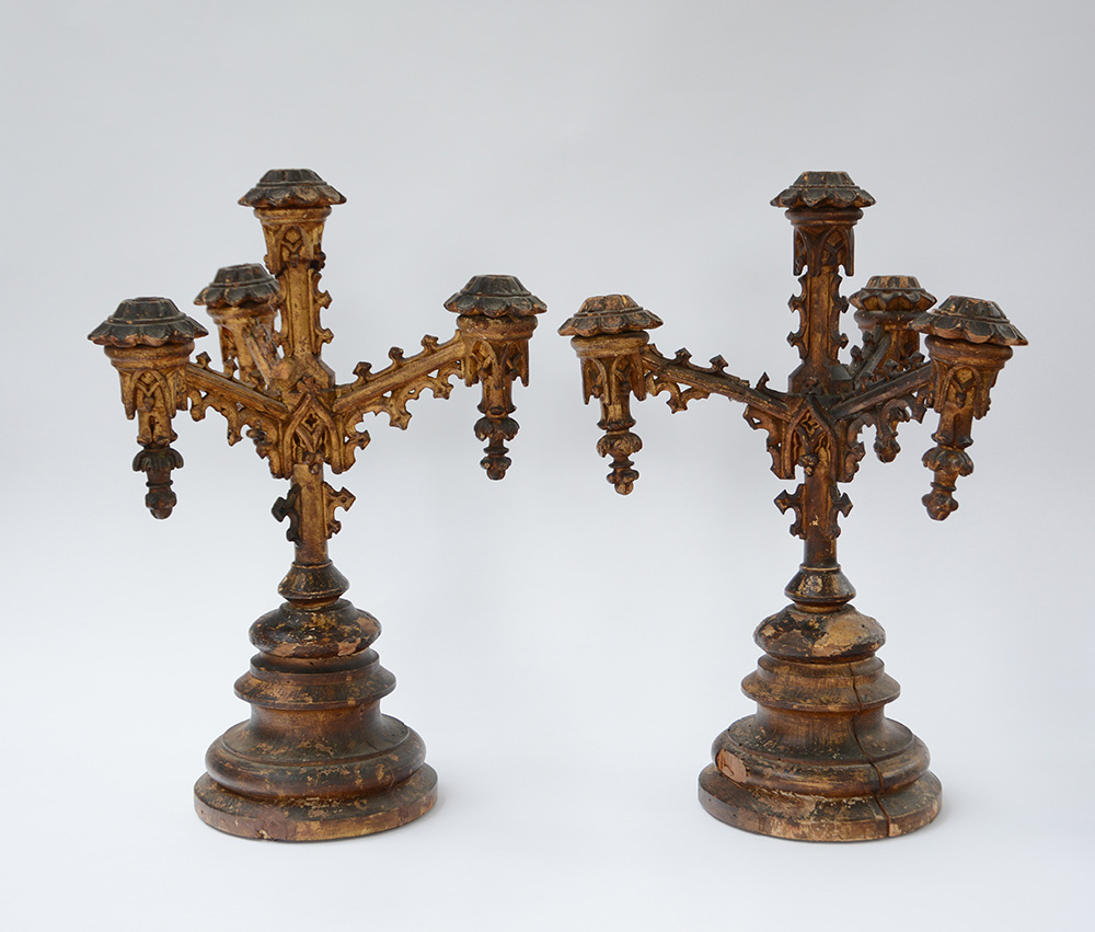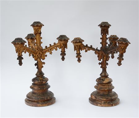 Coppia di candelabri a quattro fiamme di gusto neogotico in legno dorato, basamento tornito e bracci intagliati ad archetti pensili (h cm 60) (difetti e restauri)