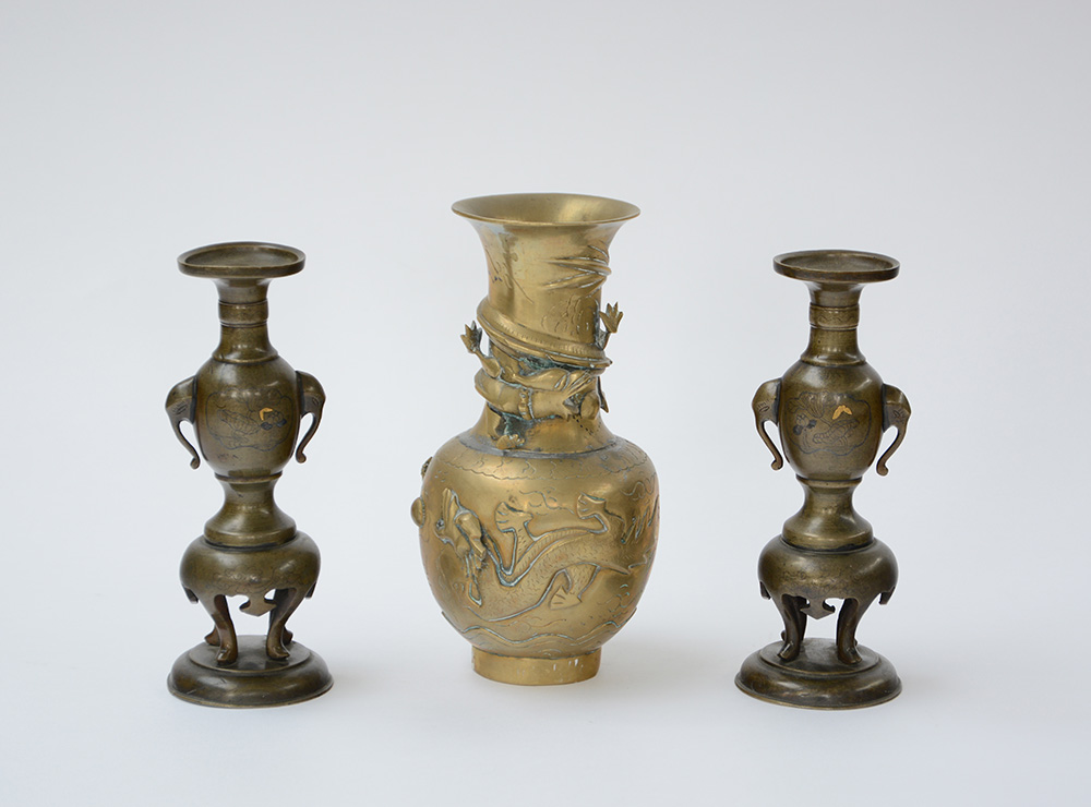 Lotto composto da una coppia di vasetti con supporto tripode in bronzo e anse a teste d’elefante e una vaso in bronzo decorato con draghi, marchio apocrifo alla base (h max cm 24) (difetti)