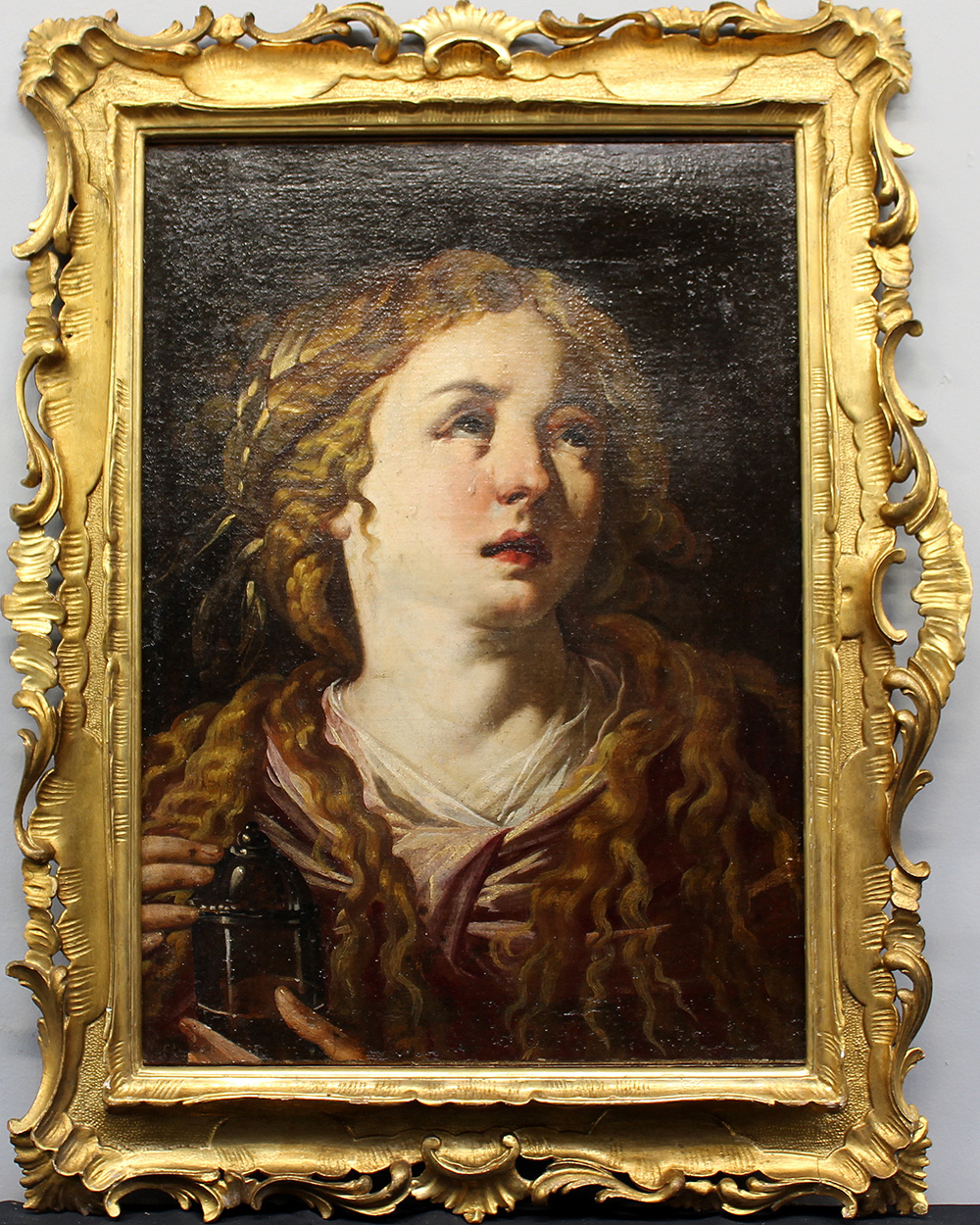 Maestro del secolo XVII "Santa in estasi" frammento ad olio su tela (cm 60x43), cornice intagliata e dorata (difetti e restauri)