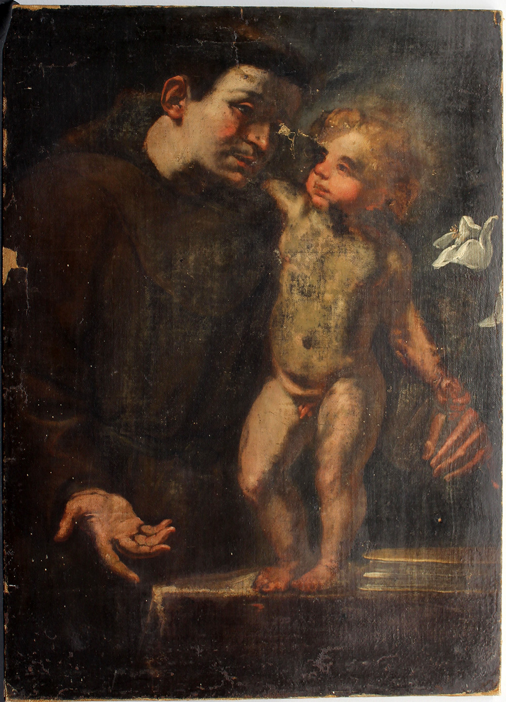 Scuola del secolo XVII, "Sant’Antonio da Padova con Bambino", olio su tela (cm 92x66) (gravi difetti e restauri)
