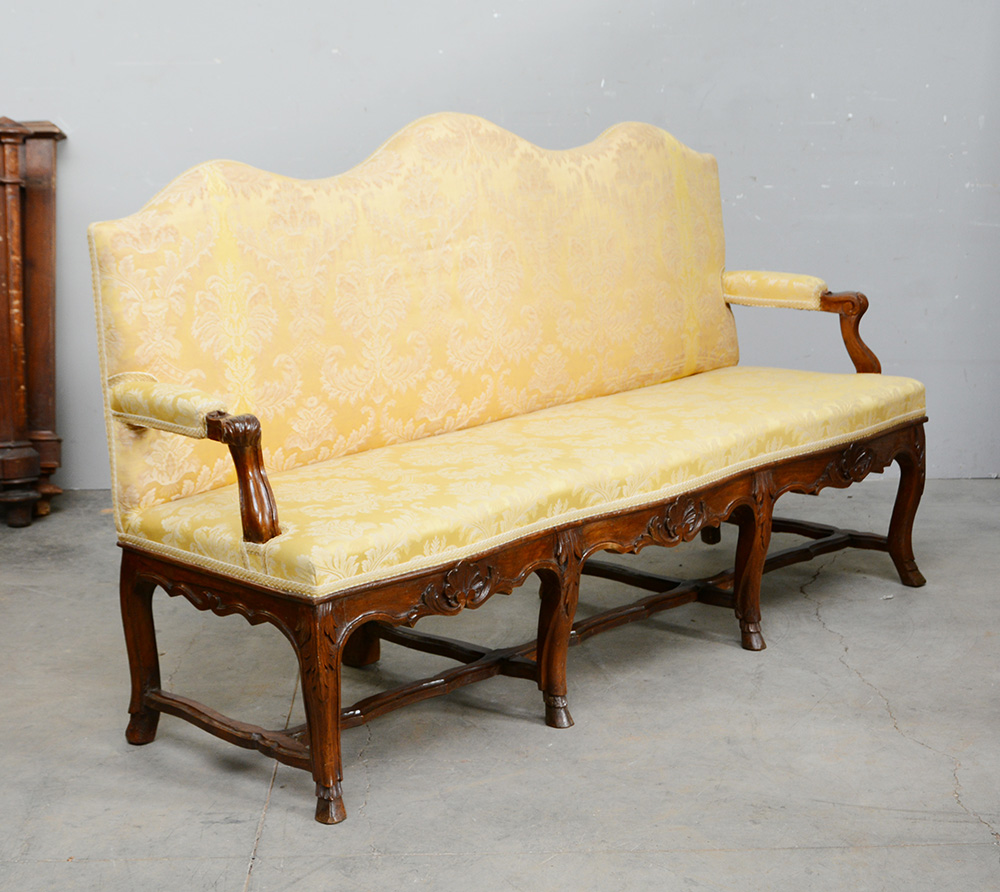 Divano a tre posti con fascia e gambe sagomate ed intagliate, traverse mosse, piedini a zampa caprina, rivestito in tessuto giallo contrattagliato (difetti)