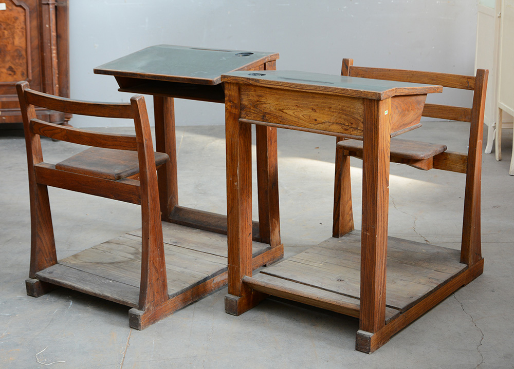 Lotto 3554 | Coppia di banchi da scuola con sedia incorporata, piano in maro chino verde...