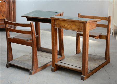 Coppia di banchi da scuola con sedia incorporata, piano in maro chino verde con vani portapenne e portacalamaio, inizio del secolo XX (difetti, mancanti del calamaio)