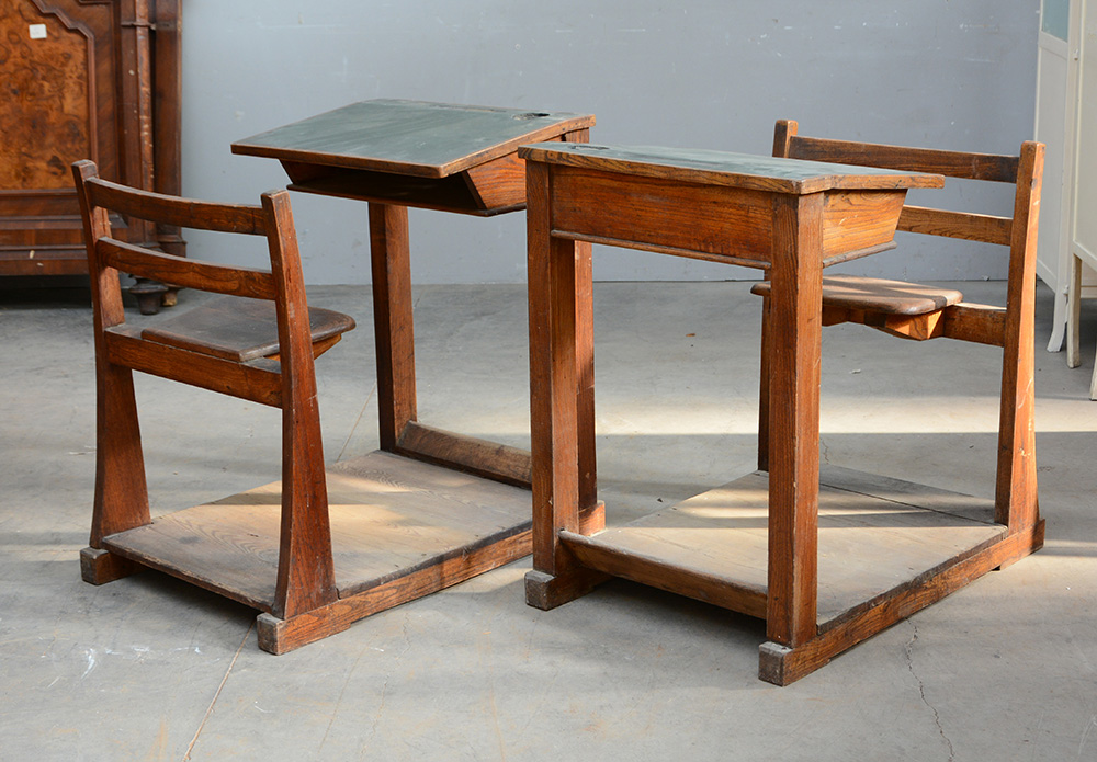 Coppia di banchi da scuola con sedia incorporata, piano in maro chino verde con vani portapenne e portacalamaio, inizio del secolo XX (difetti, mancanti del calamaio)