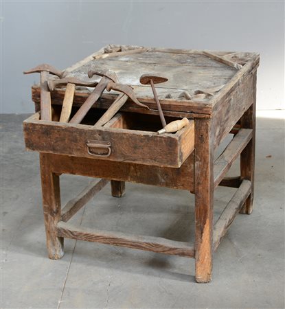 Vecchio tavolino da calzolaio ad un cassetto, gambe e traverse dritte con sei attrezzi annessi (cm 62x64x62)(difetti)
