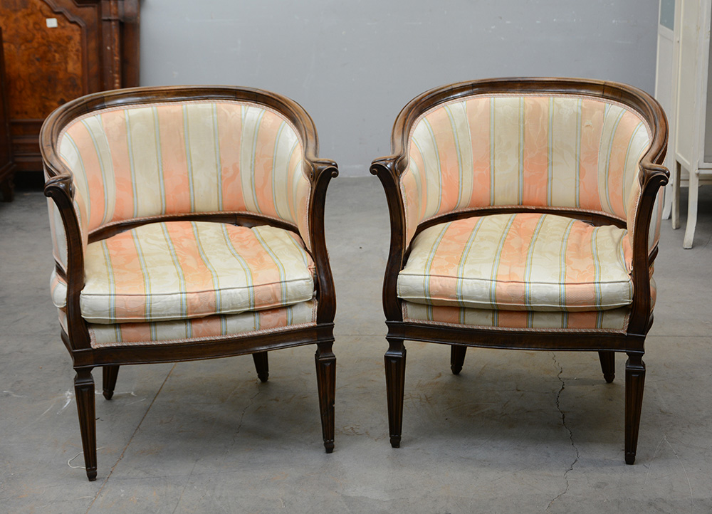 Coppia di poltrone a pozzetto con montanti sagomati e gambe rastremate, rivestite in tessuto a righe (difetti)