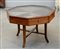Vetrina bassa da esposizione di forma ottagonale lastronata in radica di olmo e filettata in legno chiaro. Due cassetti a spicchio sovrapposti per ogni lato, quattro gambe mosse riunite da traverse, fine del secolo XIX (cm 100x69x100)(difetti)
