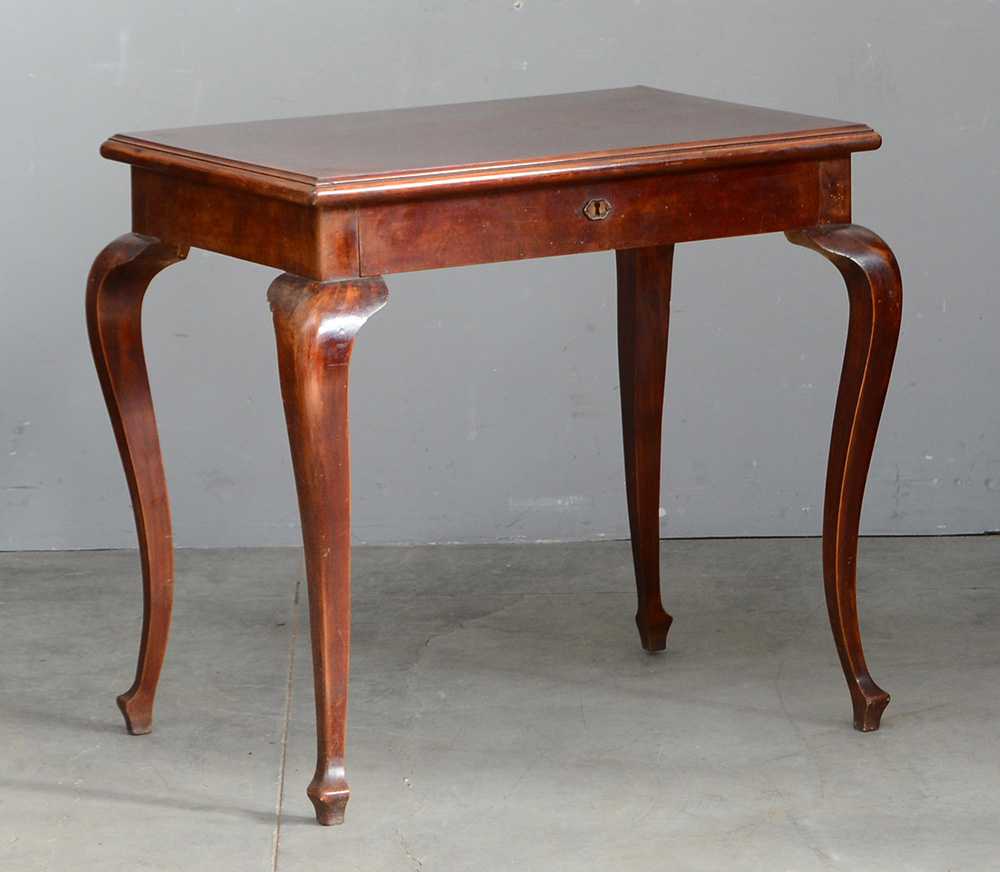 Scrittoietto da centro ad un cassetto sottopiano, gambe mosse, fine del secolo XIX (cm 79x72x53)(difetti)